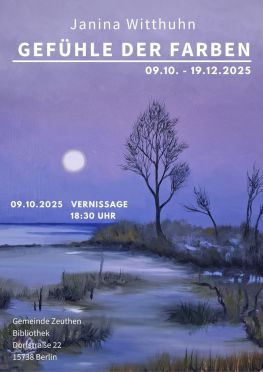 Kunstausstellung in der Bibliothek Zeuthen! Unter dem Titel "Gefühle der Farben" präsentiert die Künstlerin Janina Witthuhn ihre Ölgemälde, die die vielfältigen Emotionen und Stimmungen, die Farben ausdrücken können, zum Leben erwecken. Es werden Ansichten aus der Natur in klassischer Ölmaltechnik präsentiert. Das denkmalgeschützte Tagelöhnerhaus beherbergt im Dachstuhlbereich die Arbeiten vom 9. Oktober bis zum 19. Dezember 2025.